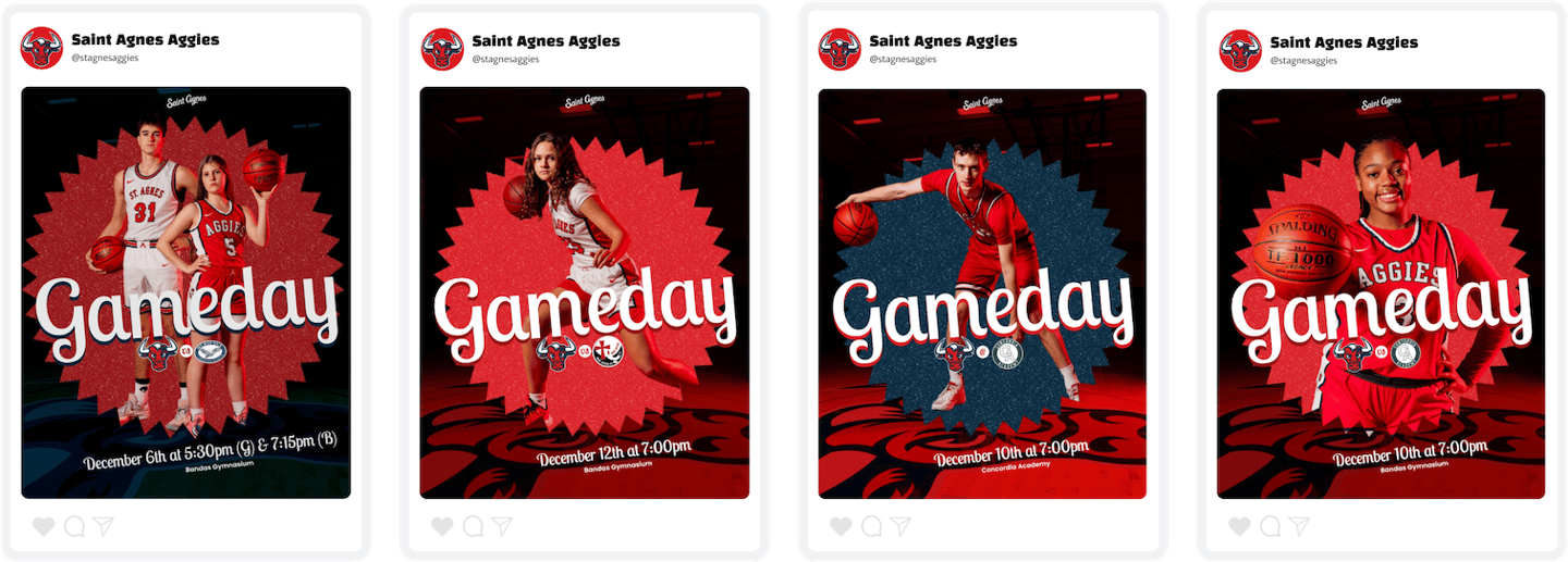 Game day templates, score update templates, & more help St. Agnes promote events and results across their 13 sports programs.