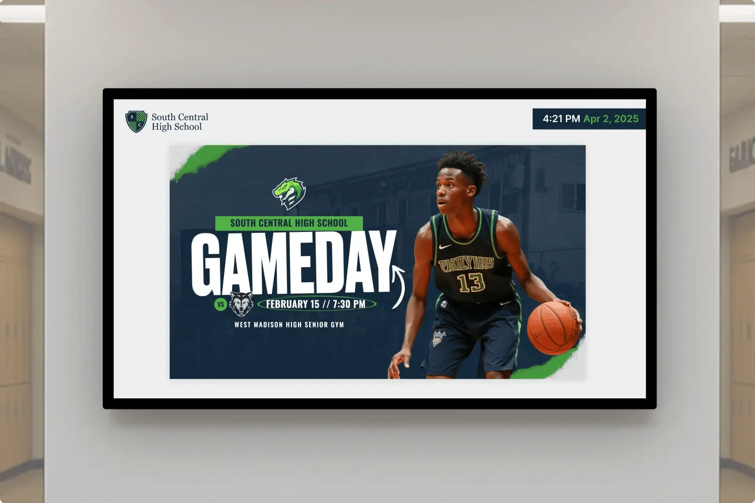 Use your TVs to promote events happening across your campus. Share gamedays, band concert details, community fundraisers and more in your hallways to boost attendance and support.